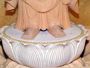 「右足を見て下さい。右足を少し前に出しておられるでしょう。普通は両足を揃えて直立不動なんですが、これから苦しむ人々を救いに行かれるところを表現するため、右足を少し前に出しておられるんです。これが仏師さんの遊びなんです。」